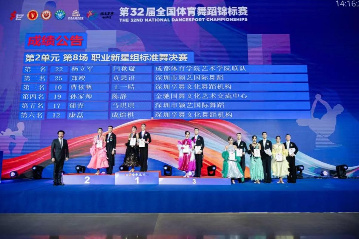 全国体育舞蹈锦标赛创立于1991年,是中国体育舞蹈发展30多年中最具影响力、最受关注、竞技水平最高、参与度最为广泛的精品赛事。今年赛事来自全国27个省、自治区、直辖市及香港特别行政区的181支代表队、5000人次参赛选手齐聚这里,经过4天激烈角逐,我们研究生闫秋璇及优秀毕业生杨立军作为中国体育舞蹈联合会职业注册选手,最终摘得职业新星组标准舞冠军,这也是我们学生在职业组获得的历史性成绩。
