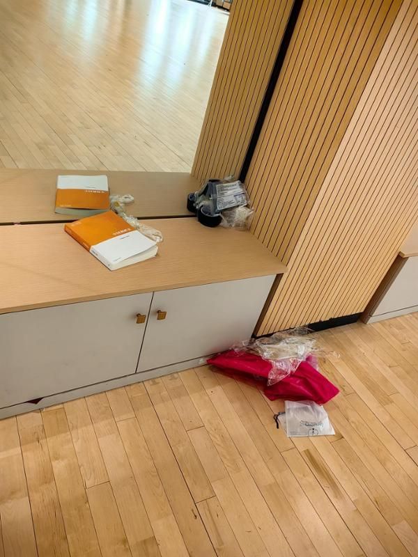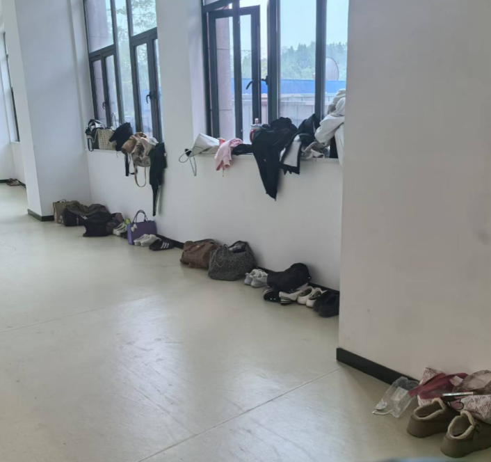 存在极少数部分学生物品随意扔在走廊。已及时让学生把物品摆放整齐,再次让教研室负责人转达学生物品入柜、整齐摆放、不带食物进舞蹈房的问题。
